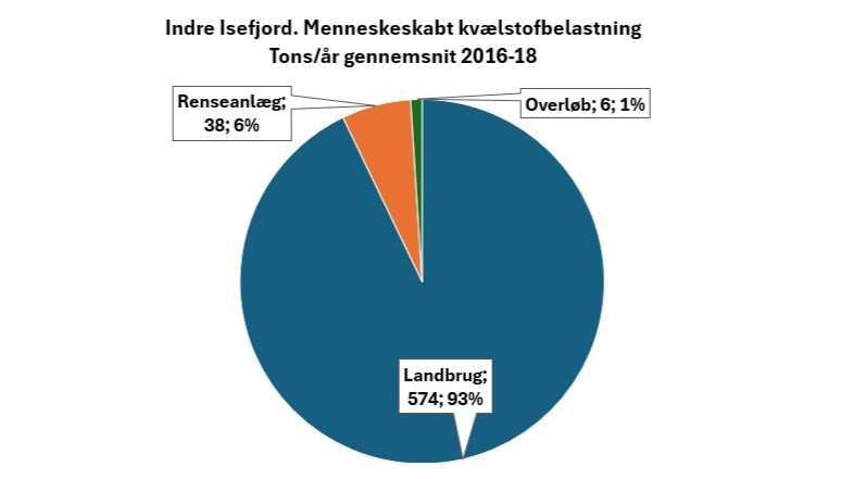 I den indre del af Isefjord stammer 93 procent af den menneskeskabte udledning af kvælstof fra landbruget og 7 procent fra rensningsanlæg inklusive overløb som følge af voldsom regn.