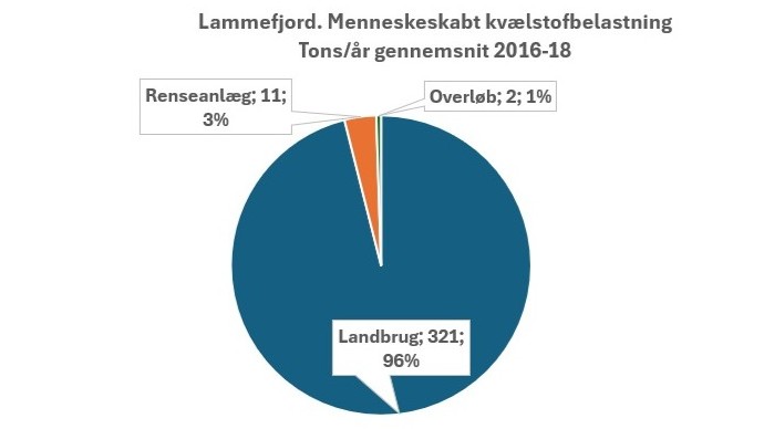 I Lammefjord stammer hele 96 procent af den menneskeskabte udledning af kvælstof fra landbruget. Kun 4 procent stammer fra rensningsanlæg og overløb.Sådan ser tallene ud, når man ser bort fra den naturlige tilstrømning af kvælstof og stiller skarpt på den mængde, vi mennesker har ansvaret for.